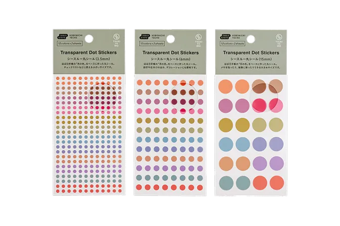 The Transparent Dot Stickers are made of sturdy, transparent PET material and come in round shapes that fit neatly within the grid of the Hobonichi Techo. Available in three different sizes.