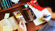 ①ペン類はもちろん、すこしかさばるハサミや修正液まで、