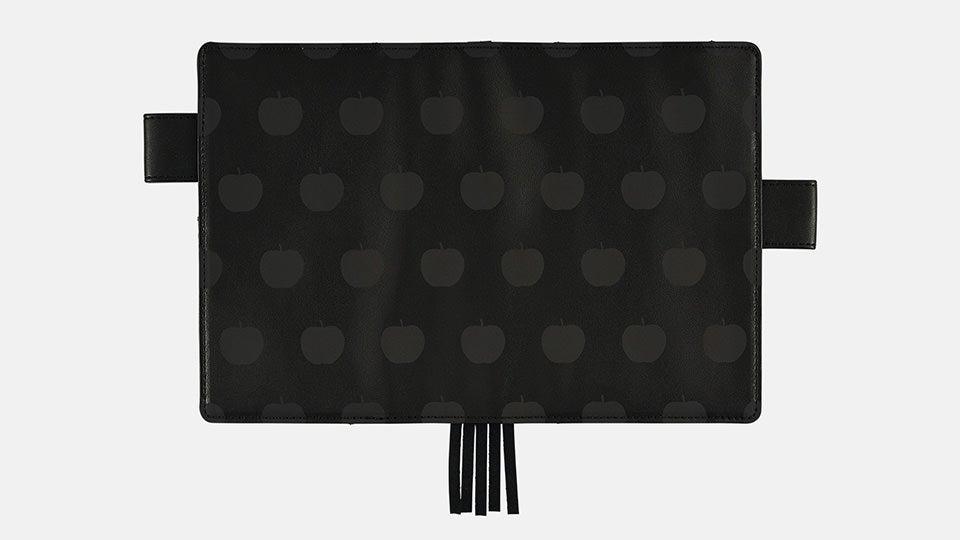 黒い合皮に、濃いグレーのりんごが並ぶ