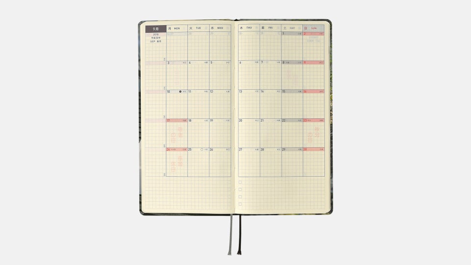 - 週番号/六曜(大安、仏滅など)/二十四節気(立春、春分、夏至など)/祝日、記念日など(バレンタインデー、ひなまつり、母の日、父の日など)/月の満ち欠け(週間ページ全てに記載・月間カレンダーに満月と新月のみ記載)