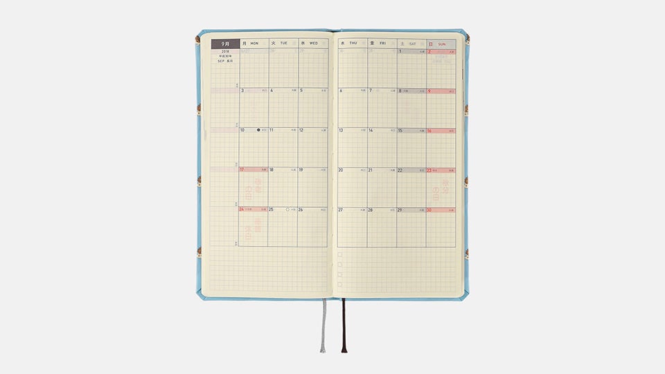 - 週番号/六曜(大安、仏滅など)/二十四節気(立春、春分、夏至など)/祝日、記念日など(バレンタインデー、ひなまつり、母の日、父の日など)/月の満ち欠け(週間ページ全てに記載・月間カレンダーに満月と新月のみ記載)