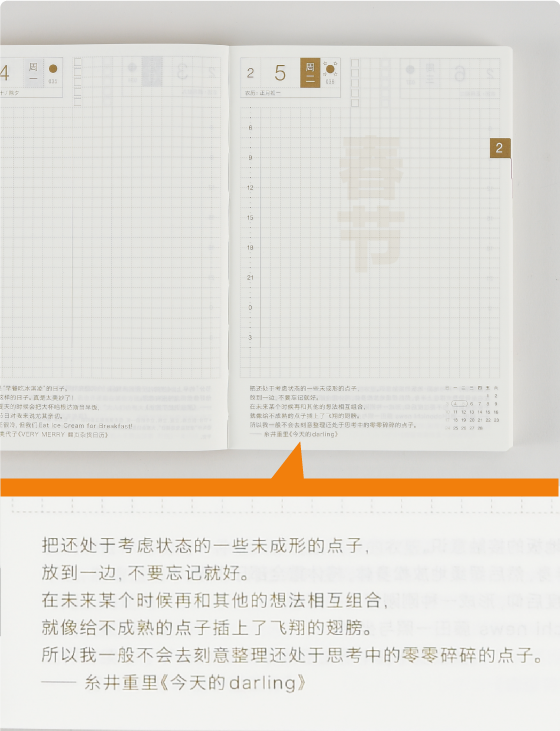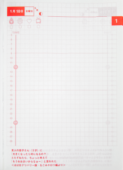 3年目、多くのかたからの「革の手帳がほしいです」という声を受けて、黒革・茶革・ヌメ革のカバーが登場。5色のナイロンカバーとあわせて8種類から選べるようになりました。カバー自体も引き続き進化し、「外側のポケット」が登場。ナイロンカバーに撥水加工をほどこしたのも、この年からでした。手帳の中身は1日ページに「秘密の縦ライン(使いたい人だけが使えるさりげない区切り線)」が登場。チェックボックスはイラストがなくなり、シンプルな見た目になりました。さらにこの年、それまで全ページに入っているわけではなかった「日々の言葉」が365日すべてに入るようになりました。「ほぼ日刊イトイ新聞」から生まれた手帳ならではの特徴として、以来毎年収録されています。
