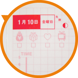 想像していた以上に「ほぼ日手帳2002」の評判が良く、2002年4月に2003年版の製作が決定。カバーの種類が増え、4色から選べるようになりました。この年のカバーは表に白のシルクプリントで”ONLY IS NOT LONELY ”の文字が入ったもの。またこの年から、留め具としても機能する2つのペンさし「バタフライストッパー」が登場。以降、多くのカバーで採用される、ほぼ日手帳の特徴のひとつに。この年からはじまったおまけのボールペンも好評で、現在まで続いています。そのほか、さまざまなかたの声を参考に、方眼のサイズを大きくしたり(3ミリ方眼→4ミリ方眼)、1日ページの時間軸のデザインを変えたり、下の言葉の数を増やしたり、年間カレンダーや年間予定表(現:年間インデックス)を収録したりなど、多岐にわたる改良をおこないました。