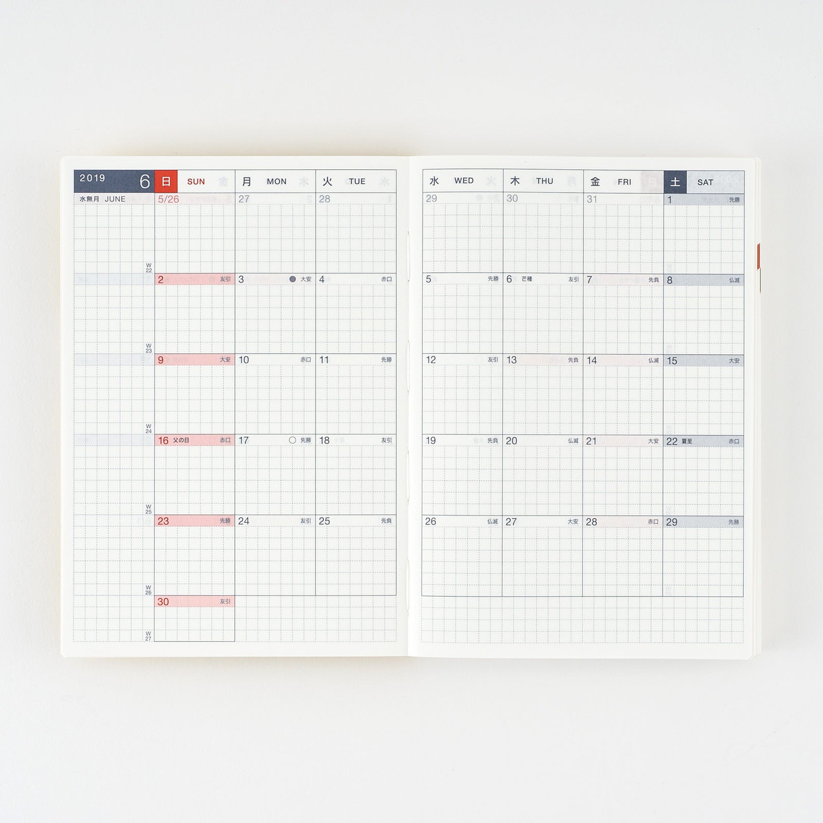 | 記載される内容 | 日番号/週番号(月間カレンダーに記載)/旧暦/六曜(大安、仏滅など)(月間カレンダーに記載)/二十四節気(立春、春分、夏至など)、雑節/祝日、記念日など(バレンタインデー、ひなまつり、母の日、父の日など)/月の満ち欠け(1日ページ全ページに記載、月間カレンダーに満月と新月のみ記載) |