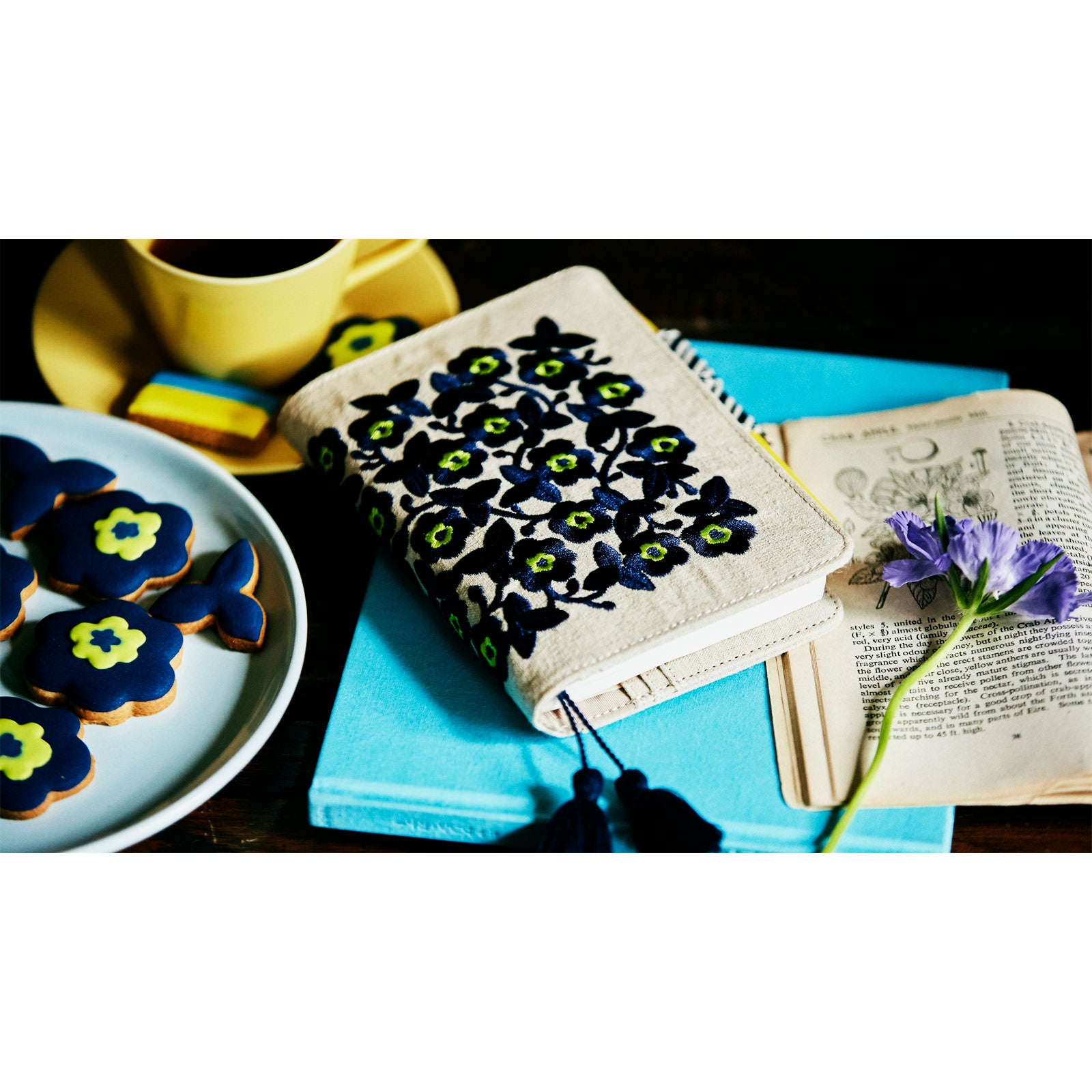 ネイビーの花に、蛍光の黄色がアクセント。
