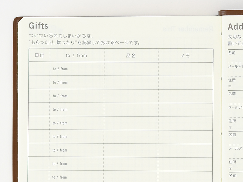 ついつい忘れがちな”もらったり、贈ったり”を記録しておけるページです。贈り先や贈り主、品名、日付などをオリジナルは17件分、カズンでは40件分、書き込むことができます。