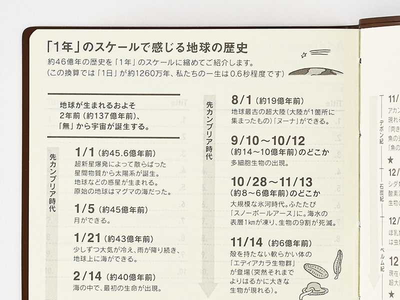 約46億年の歴史を「1年」のスケールに縮めてご紹介します。地球のこれまでに思いを馳せることで、「いま」が、すこし違って見えてきます。