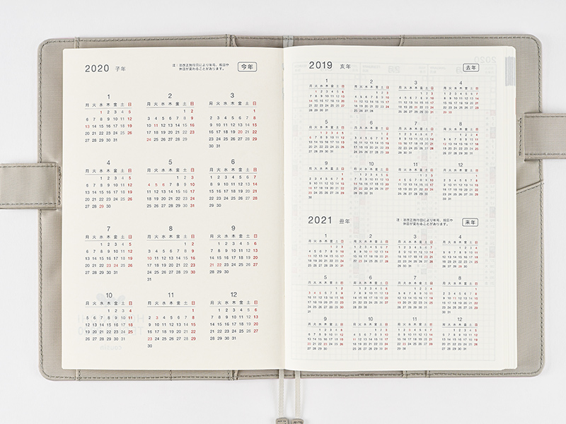 2019年、2020年、2021年の3年分のカレンダーを見開きで掲載しています。ぱっと見たときにわかりやすいように「去年」「今年」「来年」の表記入りです。