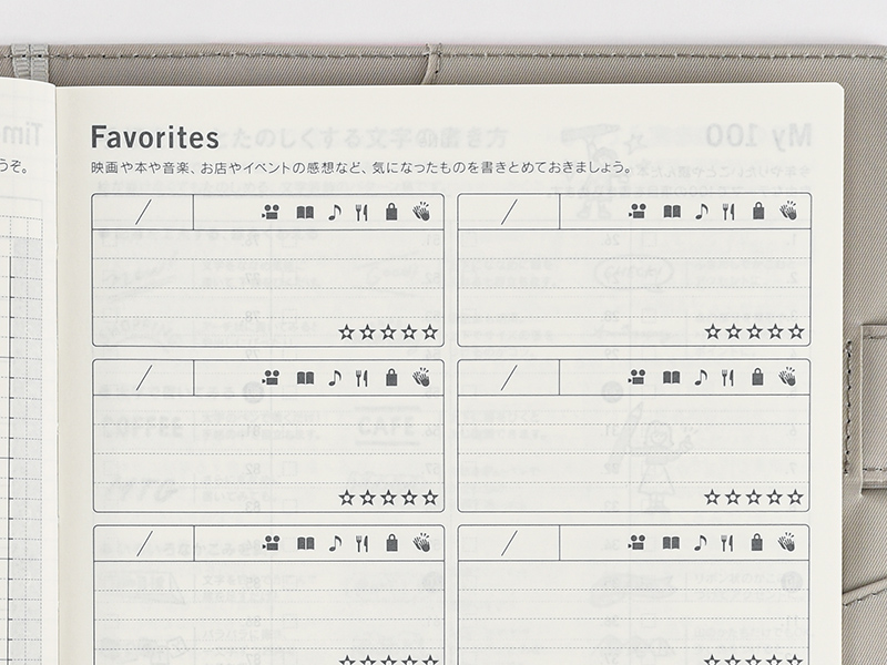 映画、本、音楽、レストラン、買ったものなど、お気に入りのものを書きとめておくページ。5段階の「☆」マークを使えば、自分だけのランキングもつくれます。