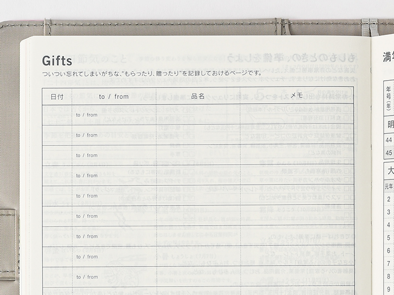 いただいたものや、贈ったものを忘れないようにメモしておくページです。贈り先や贈り主、品名、日付などを20件分書き込むことができます。