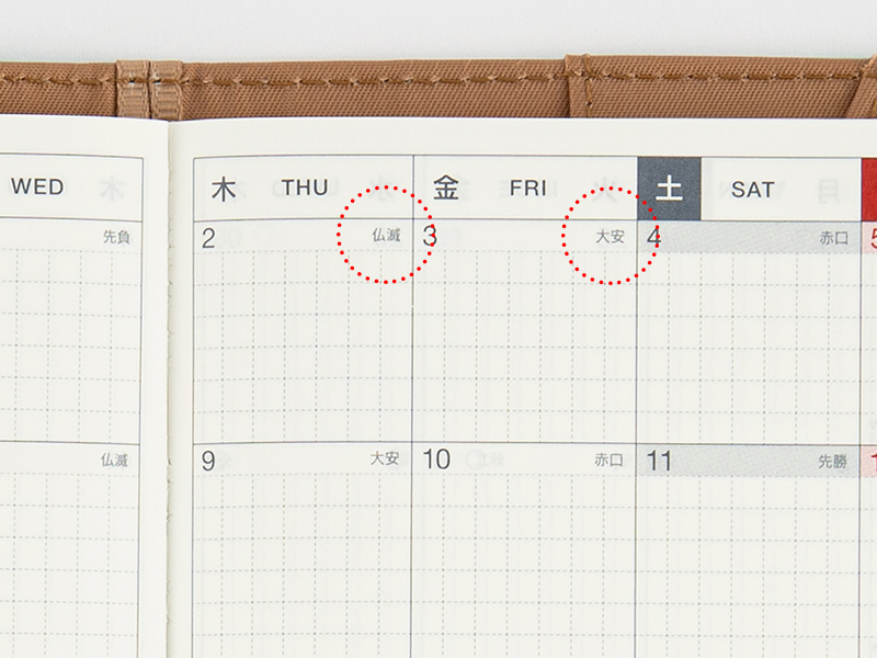 「大安」「仏滅」といった六曜を表記しています。大事な行事の日取りを決める際にお役立てください。