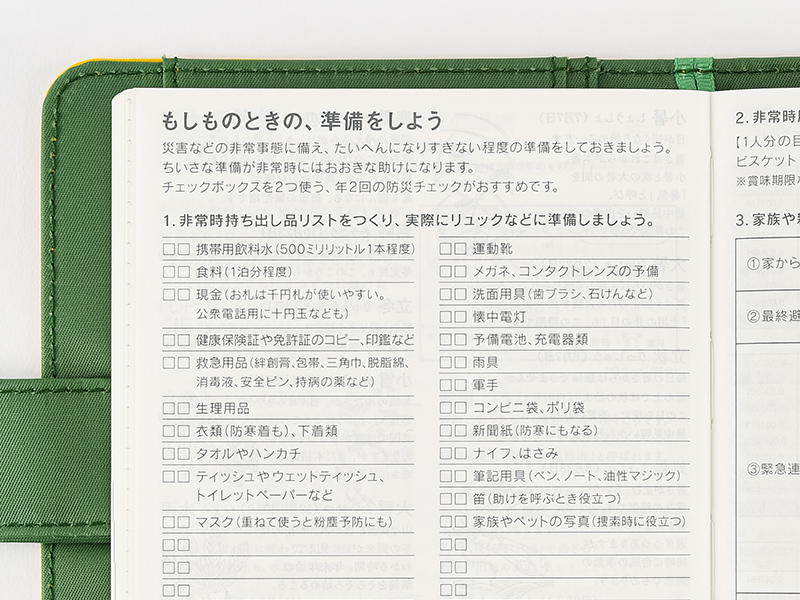 非常時の持ち出し品と、ふだんから備蓄しておきたいものをまとめました。避難場所や緊急連絡先など、家族や親しい人と話し合ったことを書いておけるスペースもあります。