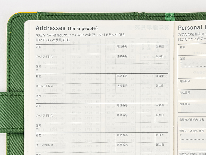 家族や友人の連絡先など、6名分の情報を書いておけるアドレス帳です。