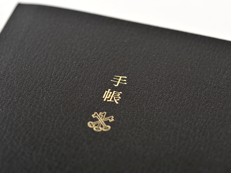 表紙はマットな質感のクロス張りです。漢字の「手帳」の文字と、ARTS&SCIENCEのトレードマークである鍵のマークが箔押しされています。背の部分には「HOBOのロゴ」と「年号」を入れました。