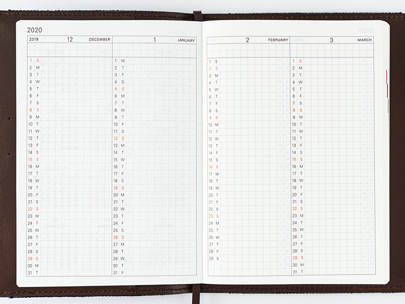 4ヵ月を見開きで一覧できる長期的な予定管理のページを2019年12月から2021年3月まで16ヵ月分収録。ページの上部には、自由に書き込めるスペースを2ライン分設けています。