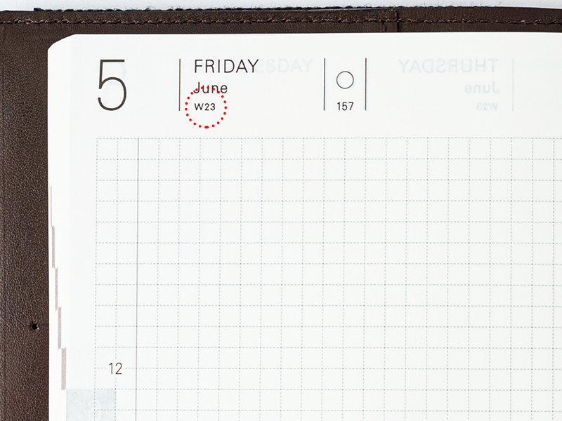 1ヵ月ごとの区切りがわかりやすいように、辞書のような各月のツメをつけました。チャコールグレーは平日、赤色は日曜を表しています。