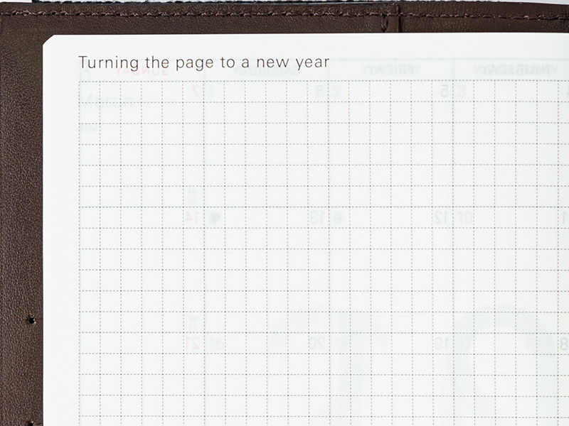 手帳を使いはじめるときのウォーミングアップ用ページです。前の年の出来事を振り返ったり、新年の決意を書いたり、古い手帳から引き継ぐ内容を記したりなど、自由にお使いください。