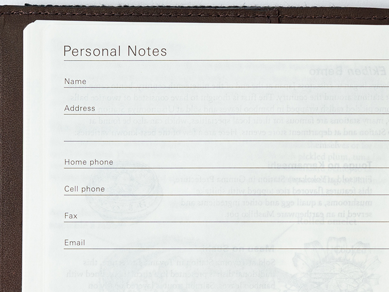 氏名、生年月日、住所、電話番号など自分の情報をまとめて書いておくページです。知られて困るような情報の取り扱いにはご注意を。