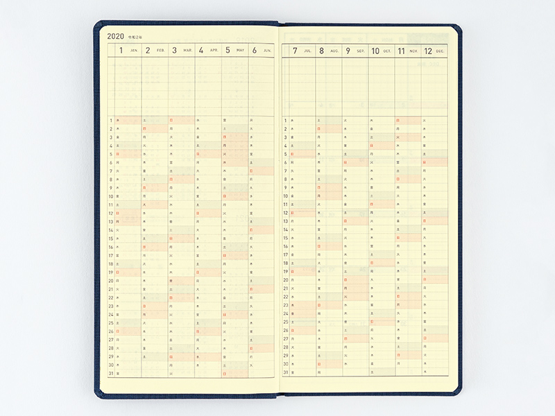 1年分を見開きで一覧できる、長期的な予定管理のページです。ページの上部に7ライン分の自由なスペースを設けました。<掲載期間>1月はじまり版:2020年1月~2020年12月4月はじまり版:2020年4月~2021年3月