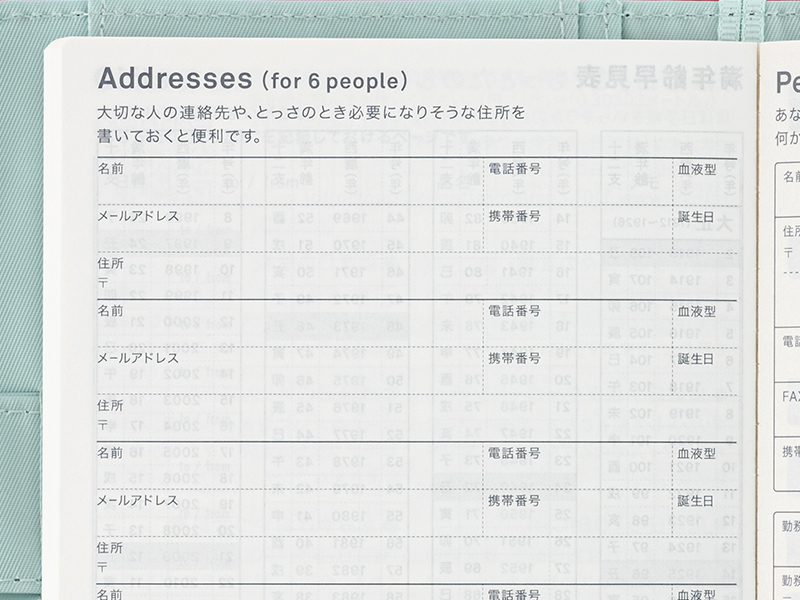 家族や友人の連絡先など、オリジナルサイズは6名分、カズンサイズは8名分の情報を書いておけるアドレス帳です。