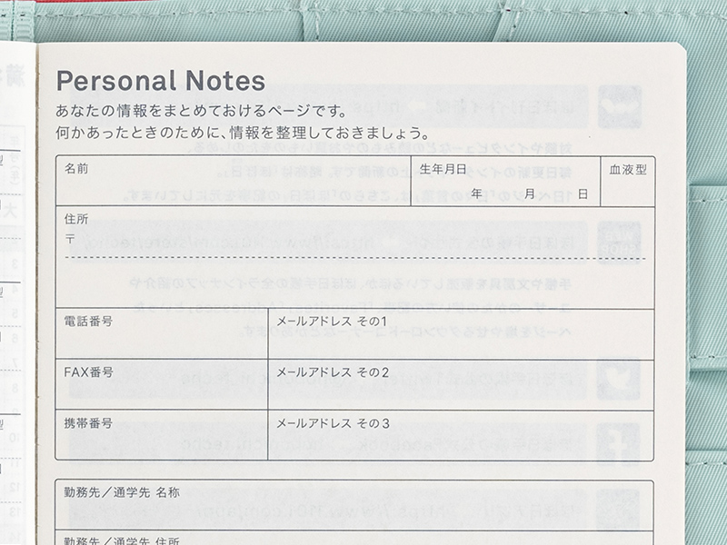 氏名、生年月日、住所、電話番号など自分の情報をまとめて書いておくページです。知られて困るような情報の取り扱いにはご注意を。