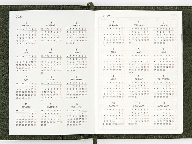 2021年と2022年のカレンダーを見開きで掲載しています。日付は方眼のマス目に1日ずつレイアウトされています。