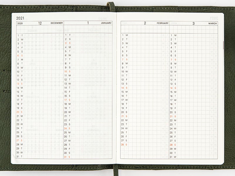 4ヵ月を見開きで一覧できる長期的な予定管理のページを2020年12月から2022年3月まで16ヵ月分収録。ページの上部には、自由に書き込めるスペースを2ライン分設けています。