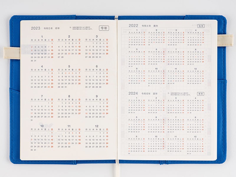 2022年、2023年、2024年の3年分のカレンダーを見開きで掲載しています。ぱっと見たときにわかりやすいように「去年」「今年」「来年」の表記入りです。