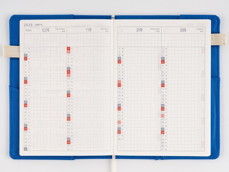 4ヵ月を見開きで一覧できる長期的な予定管理のページを16カ月分収録。(カズンサイズは、6ヵ月分を見開きで一覧でき、 12カ月分を収録しています)ページの上部には、自由に書き込めるスペースを4ライン分設けています。<「年間インデックス」掲載期間>day-free オリジナルサイズ:2022年12月~2024年3月day-free カズンサイズ:2023年1月~12月