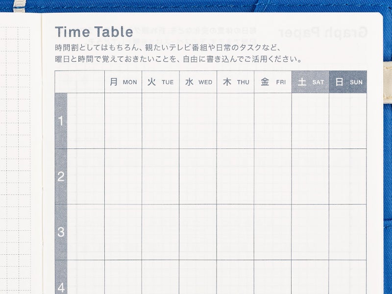 曜日ごとの決まった内容を書いておけるタイムテーブルを、オリジナルサイズは1つ、カズンサイズは2つ収録。時間割、テレビ番組の放送時間、家事当番の分担など、テーマを決めて使うことができます。