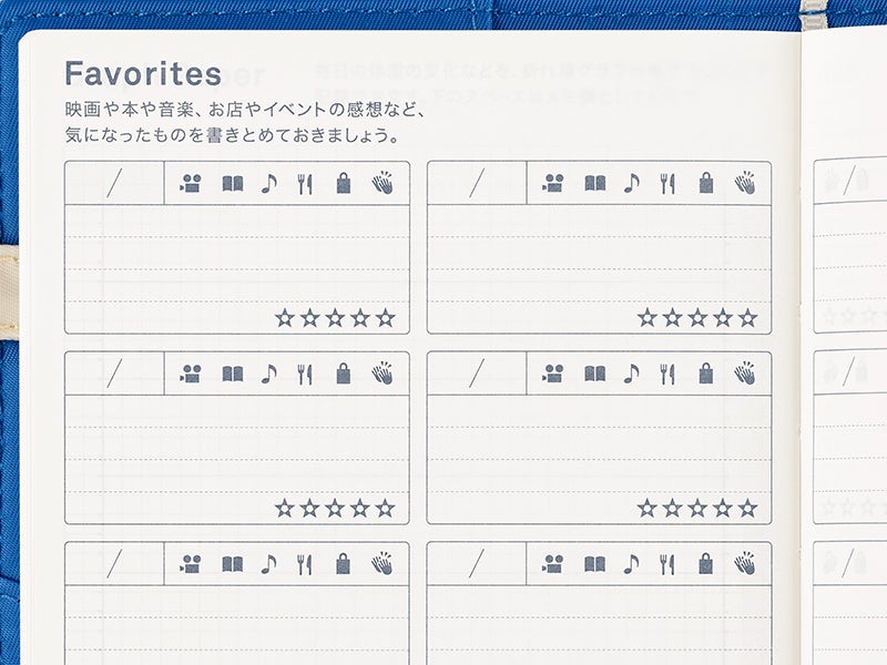 映画、本、音楽、レストラン、買ったものなど、お気に入りを書きとめておくページ。5段階の「☆」マークを使えば、自分だけのランキングもつくれます。オリジナルサイズは10個、カズンサイズは12個の好きなものを書くことができます。