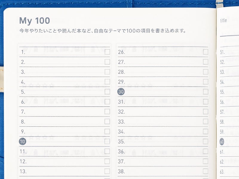やりたいことや読んだ本、見た映画など、自由なテーマで100の項目を書き込むことができるページです。