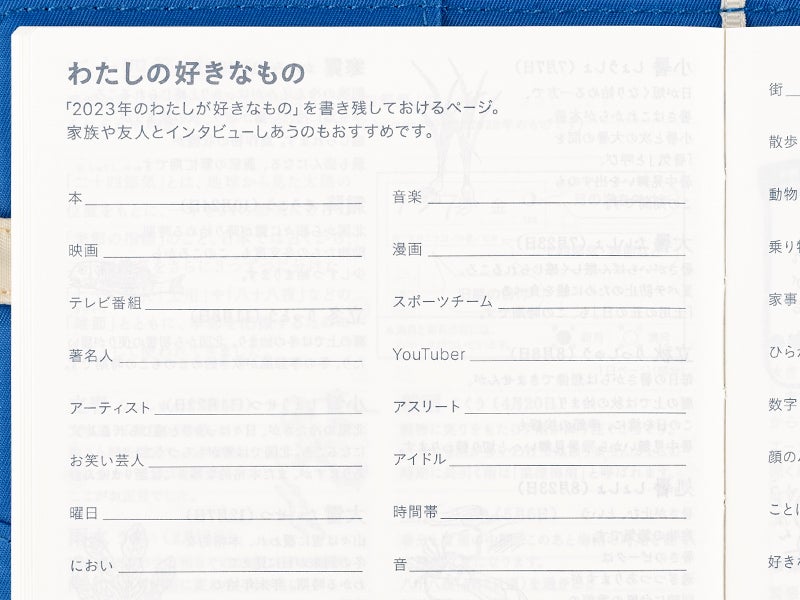 「2023年のわたし」が好きなものを書き残しておけるページ。家族や友人と、好きなものについてインタビューしあうのもおすすめです。