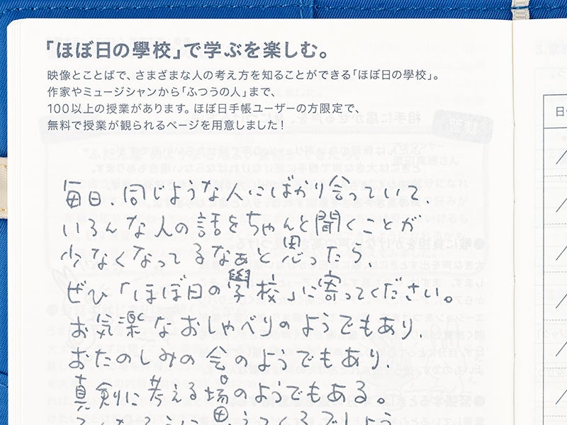 映像とことばで、さまざまな人の考え方を知ることができる「ほぼ日の學校」。作家やミュージシャンから「ふつうの人」まで、100以上の授業があります。手帳ユーザーの方限定で、無料で授業が見られるページを用意しました。