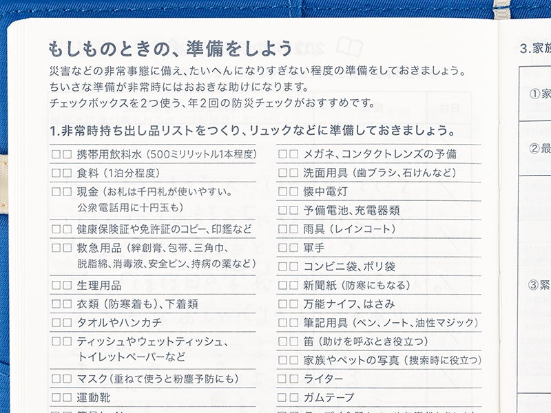 非常時の持ち出し品と、ふだんから備蓄しておきたいものをまとめました。避難場所や緊急連絡先など、家族や親しい人と話し合ったことを書いておけるスペースもあります。