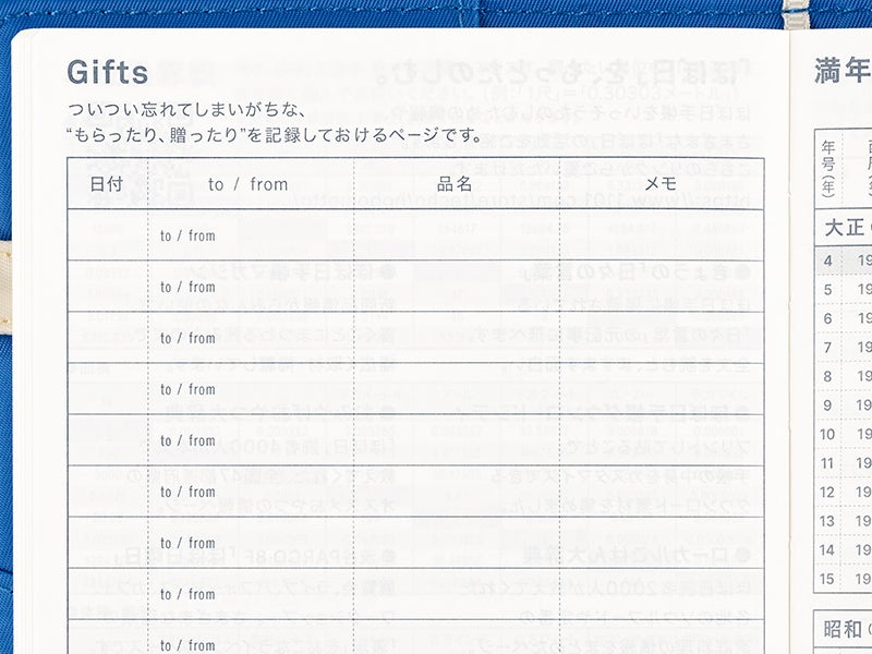 ついつい忘れてしまいがちな”もらったり、贈ったり”を記録しておけるページです。贈り先や贈り主、品名、日付などをオリジナルサイズは17件分、カズンサイズは20件分、書き込めます。