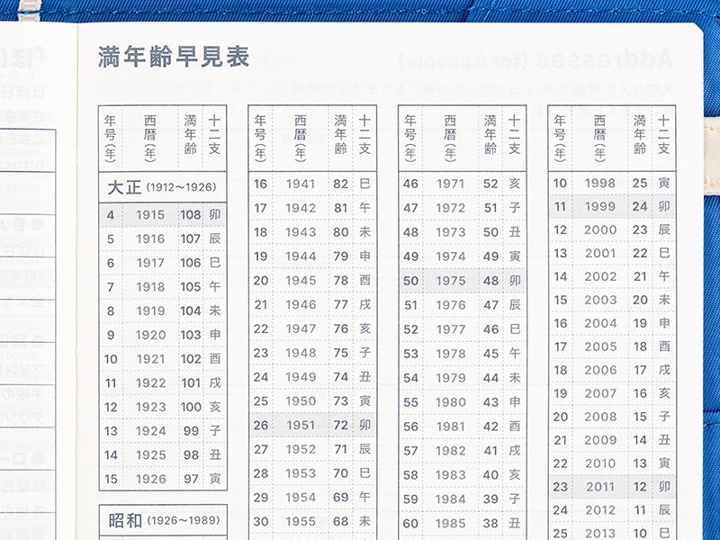 満年齢と十二支が、ひと目でわかる早見表。満年齢0歳から108歳まで掲載しています。2023年の干支である「卯」の行は背景に色を入れ、年男と年女がすぐわかるようにしました。