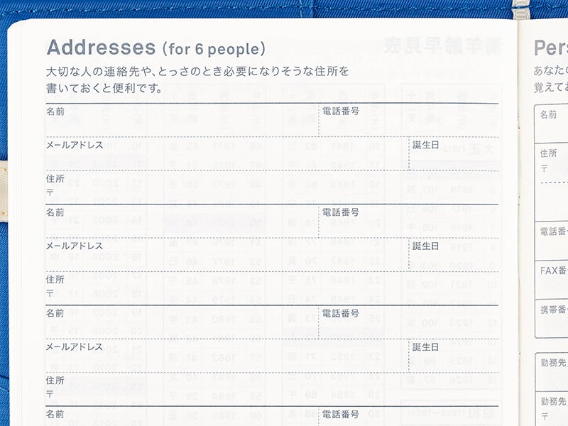 家族や友人の連絡先など、オリジナルサイズは6名分、カズンサイズは8名分の情報を書いておけるアドレス帳です。