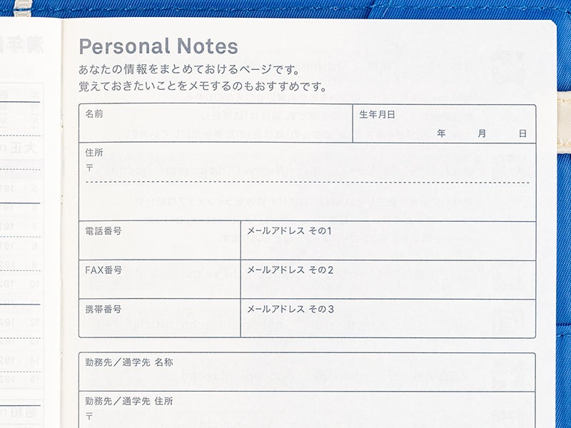 氏名、生年月日、住所、電話番号など自分の情報をまとめて書いておくページです。知られて困るような情報の取り扱いにはご注意を。