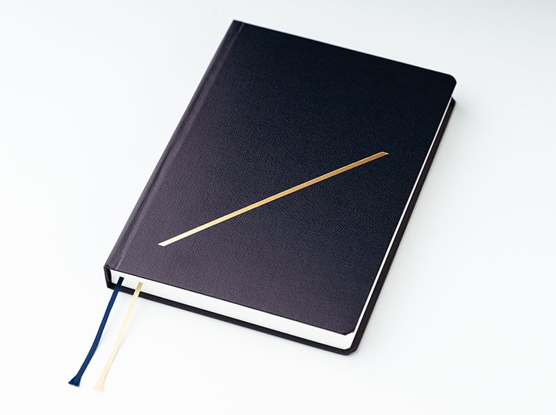 カバーをかけずに使えるかわりに、本体に2本のしおりをつけました。ネイビーとベージュの2本のしおりをよく開くページに1本ずつ挟んでおくと便利です。