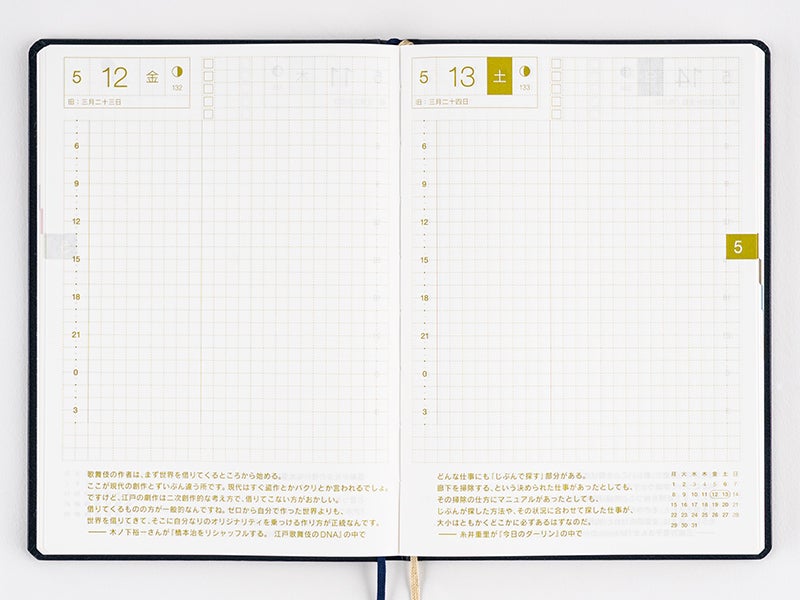 ほぼ日手帳が誕生した2002年版からの定番「1日1ページ」がメインの手帳です。「HON」でも本体に使用されている用紙は手帳専用紙の「トモエリバー」。収録内容は「ほぼ日手帳オリジナル」と同じ。2023年1月1日~12月31日の1日1ページはもちろん、ページの下部には「日々の言葉」も各ページに掲載しています。そのほか、年間カレンダーや月間カレンダー、年間インデックス、巻末のおまけページなど「オリジナル」と同じ内容を収録しています。