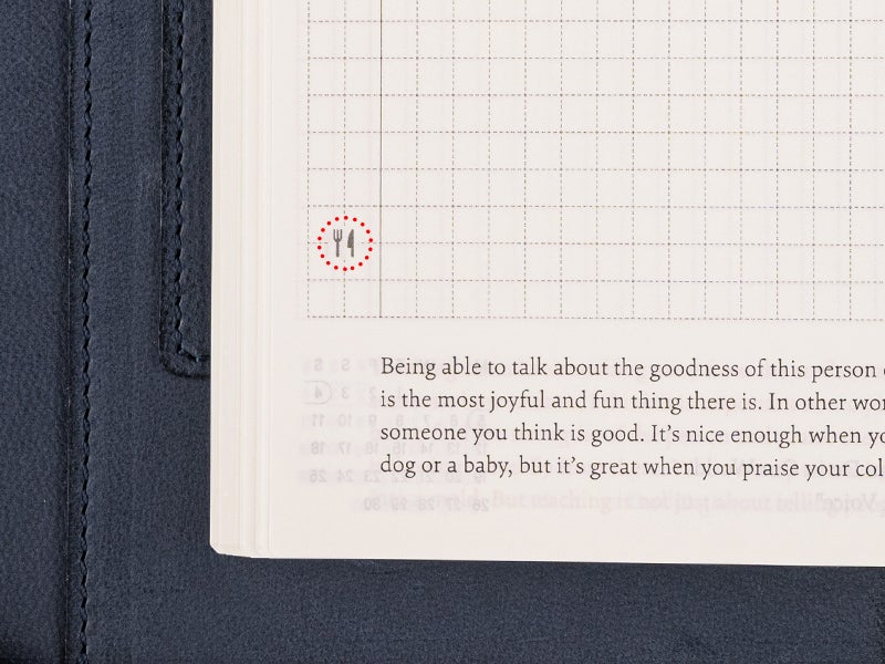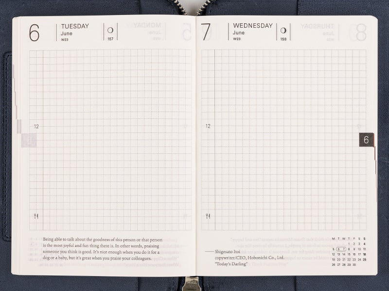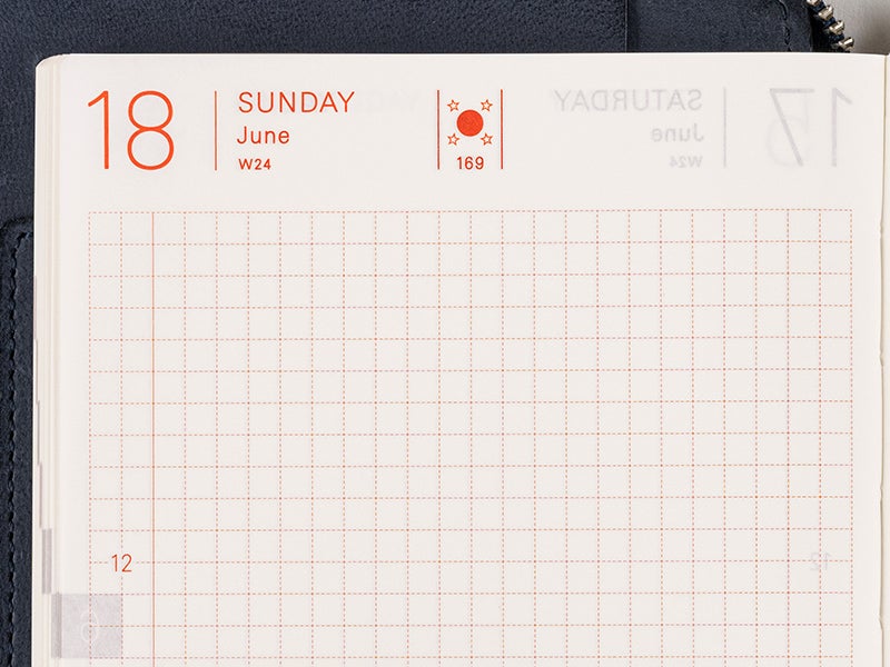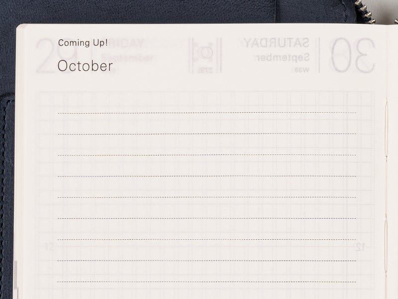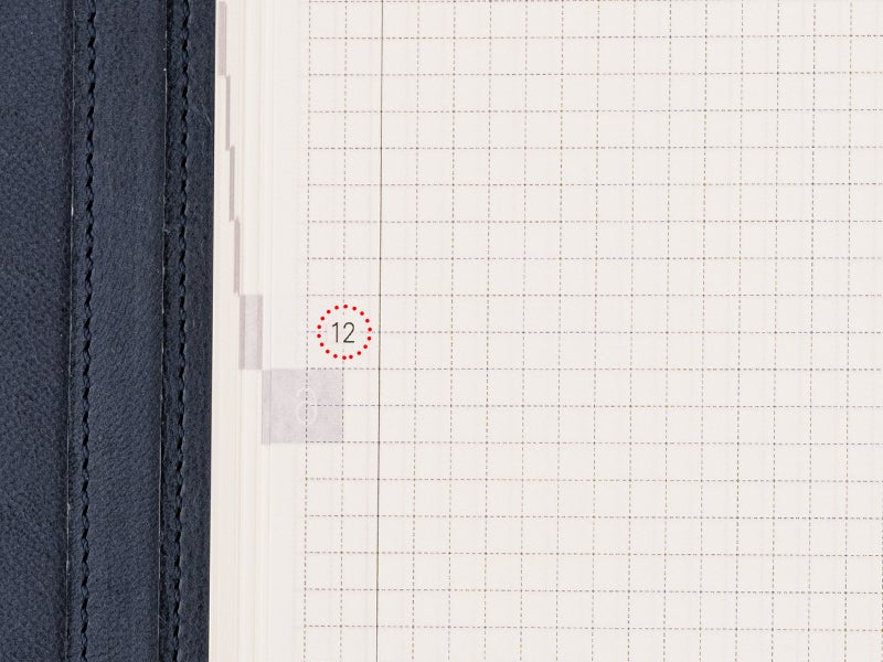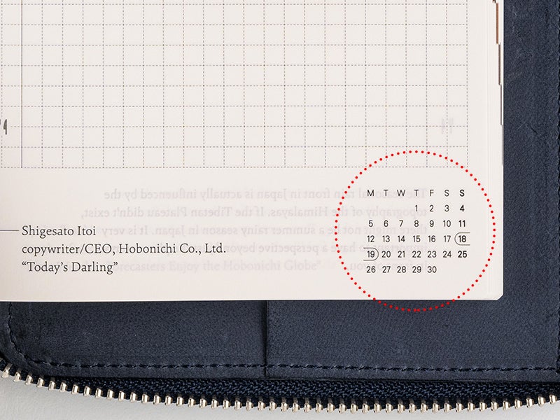 1ヵ月ごとの区切りがわかりやすいように、辞書のような各月のツメをつけました。チャコールグレーは平日、赤色は日曜を表しています。