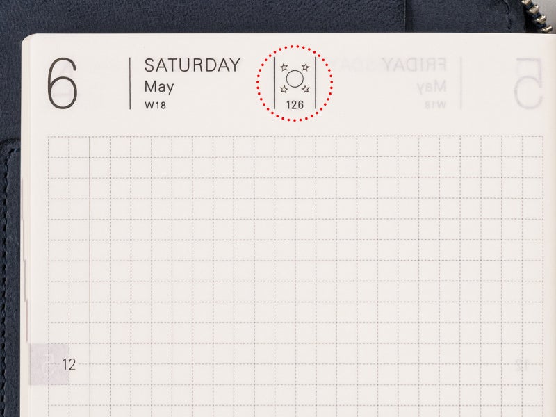 1月1日から数えて何日目であるかを表した「日番号」と、日本でその日に見られる月の形を記載しています。
