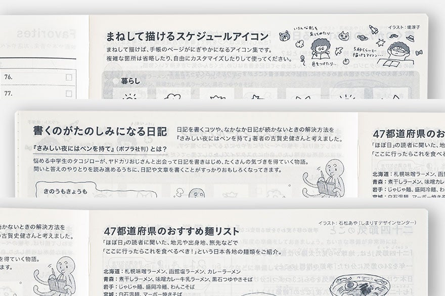 | おまけページ | Time Table/Graph Paper/Favorites/My 100/まねして描けるスケジュールアイコン/書くのがたのしみになる日記/47都道府県のおすすめ麺リスト/二十四節気のこと/もしものときの、準備をしよう/Gifts/満年齢早見表/単位換算表/「ほぼ日」を、もっとたのしむ。/Addresses (for 8 people)/Personal Notes |