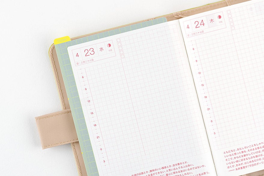 | 記載される内容 | 日番号/週番号(月間カレンダー・週間ダイアリーに記載)/旧暦/六曜(大安、仏滅など)(月間カレンダーに記載)/二十四節気(立春、春分、夏至など)、雑節/祝日、記念日など(バレンタインデー、ひなまつり、母の日、父の日など)/月の満ち欠け(1日ページ全ページに記載、月間カレンダー・週間ダイアリーに満月と新月のみ記載) |