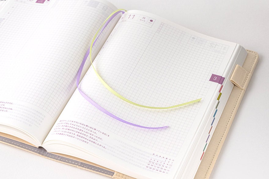 | 紙質・製本 | 薄くて軽く、なめらかな書き心地のトモエリバー(手帳専用紙)/糸かがり製本 |