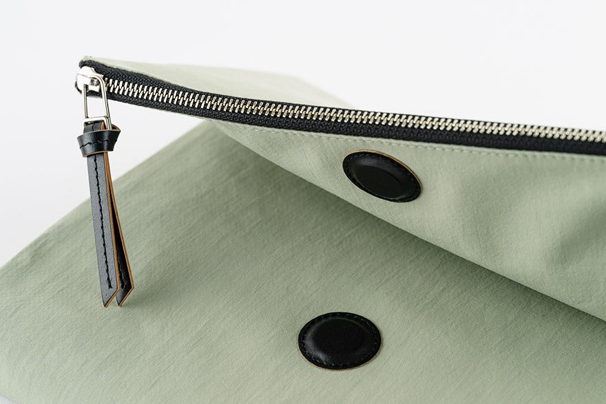 表のポケットには、レザーの引き手がついています。