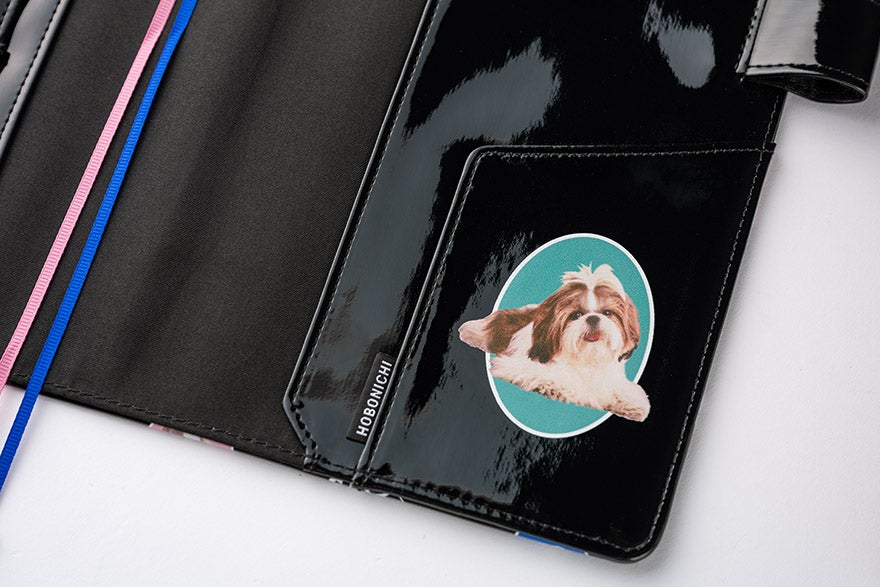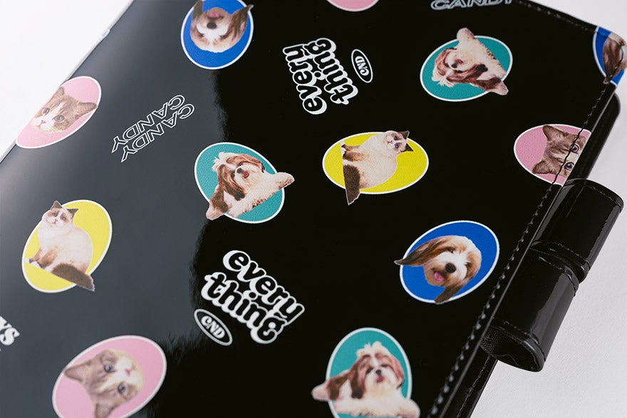 光沢のあるエナメル素材に犬と猫の写真をちりばめた、