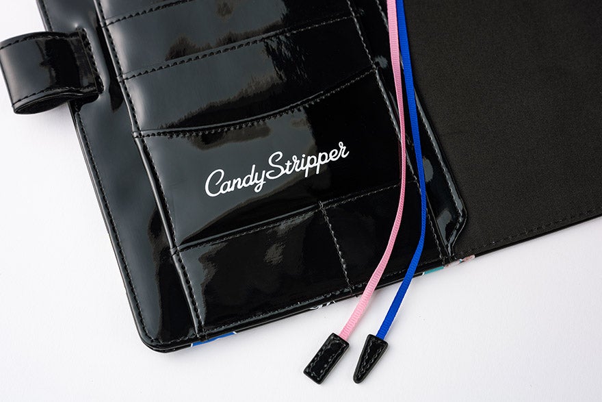 ツヤツヤのエナメル素材と淡いピンクの地が