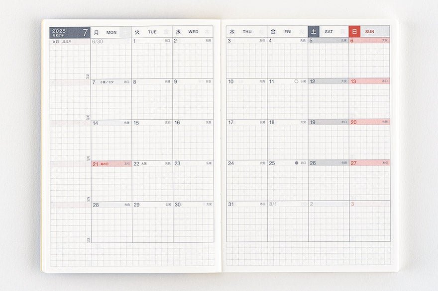 | 紙質・製本 | 薄くて軽く、裏抜けの少ないトモエリバー(手帳専用紙)/糸かがり製本 |